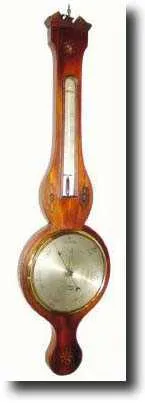 C.1870, English, Banjo or mercury wheel barometer, in good, as-found condition. The silvered brass dial signed Tognetti and Co. (most of the English barometer makers in the 19th century seem to be Italian). The tube is intact with mercury, and is corked for auto transport (not well enough to ship commercially). Also with a good Fahrenheit thermometer with a silvered brass engraved scale with novel indications: Temperate, Sum'r Heat, Blood Heat and Freezing. Note the top arch is missing (foundation is there). Height 39" $375-475