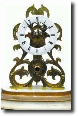 C.1870, English, Single Fusee skeleton clock on a marble base with replacement dome (cracked and with crazy glue repair). The well made scroll frame is intricate and the 6-spoke wheel work is excellent (3 spokes on motion wheels). It is unusual to see a solid porcelain dial on clocks of this era, and there is no evidence the dial has been changed. Base has been changed once to accommodate another dome. Height of clock and base, 14", and total with dome 16". $900-1200