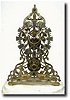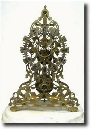 C.1870, English, Wm. Evans, Birmingham, scroll frame skeleton clock This frame pattern is often seen with a pendulum detent and sometimes a chronometer escapement, however, this one has a more conventional recoil escapement. The wheels are all nicely spoked (including motion wheels), and the original chain is intact. Much of the silvering has been rubbed off the dial, but it is still quite legible. Information on this maker and his work can be found in the book titled British Skeleton Clocks, by Derek Roberts (1987). Note the dial bears retailer's signature: AGAR and SONS, BURY. NO dome. Height 17" Reserve $1100