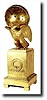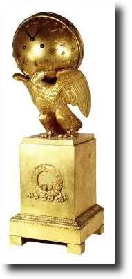 an eagle holding a globe on its shoulders. This clock has been presented twice, first to Ignatius Sargent some time after his retirement in 1864 and then again in 1927 to his son Charles Sargent on his retirement from Globe National Bank, Boston. The well made round movement is signed Douillon; he was certainly very ingenious to mount the movement in at an odd angle, then extend the bridge for the verge back 2 inches so the pendulum could swing in the small space behind the eagle. The presentation base has been rotated 180_ so the engraving is out of view in the rear. Most of the bright gilding is still intact, and the fine detail on the eagle is amazing. Must be some "Globe" company out there that would have a special interest in this item. Note the last repairman to clean this replaced mounting screws with phillips screws which can be changed back by a good mechanic. You turn rear half of globe to remove it. Height 20 inches $3500-4000