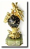 in excellent condition, and complete with dome + base with brass string inlay. This has a very small and well made platform movementÅ note unique design allowing removal of the spring barrel and unusual Geneva stopwork on the barrel end. The movement is contained in a small bronze sphere (about 2.8" diameter), with a hinged rear door that is part of the sphere. The globe is nestled in the trunk of a tree, and surmounted by a winged angel, holding the twisted corners of a blanket that support an infant. I don't know whether she is 'bringing' or 'taking' the child. Small, finely pierced gilt hands. The whole resting on a faceted block of green onyx, with a gilt bottom and 4 knurled bun feet. Height of clock 10 inches0 inches, w/dome 14" Reserve $1100