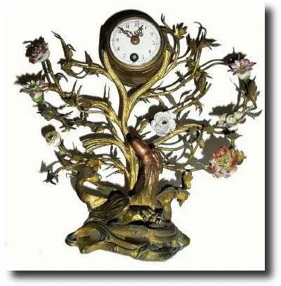 Although much of the gilding is worn away, the tree would still clean up in solution. A couple of petal tips are missing, but the flowers are intact. The well made mini French movement has a cylinder platform and is running fine, and with original gilt hands. The diameter of the dial is only 1.7", and the overall Height is 7" $1000-1500