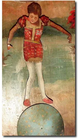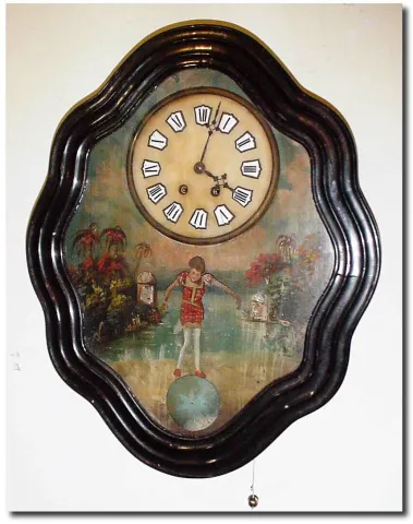 This is a very interesting clock. The front and glass are a duplexed, a hinge and hooks for the front glass, and a separate hinge and hooks for the painted scene. To the metal scene is mounted a two tune music box (manual tune change lever) with pull wind. When the music plays, the ball at the bottom rotates and the articulated dancer moves upper torso and arms as well as both legs. This is accomplished by a drum with pins raising and lowering three separate brass rods, connected to the dancer. The teeth on the music box are good, and it plays well. The cardboard dancer has been broken and reglued and could use additional attention (looks OK). Top time and strike 8-day movement is totally separate, with alabaster dial with porcelain cartouche numerals. Generally very good original condition; height 27'