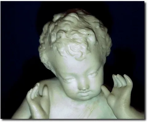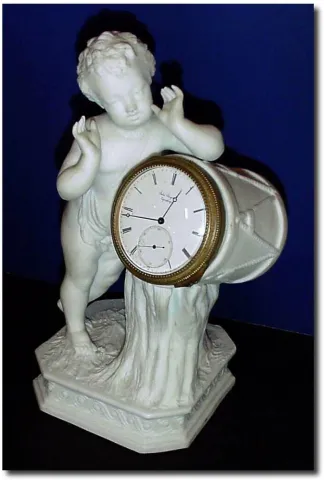 C.1875, Copenhagen, Denmark, Jules Jurgensen, Parien figure of a young boy with his drum, the well jeweled key wind lever movement held in place with a special bezel retained from the rear. The porcelain dial signed as indicated, and the movement with the name engraved and with serial number 6949. The figure is perfect with all fingers and toes intact. The movement running and with original moon hands; hairlines in dial around 6:30. Height 7'