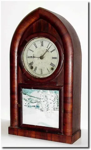 C.1875, E.N. Welch, 8-Day Beehive, as-found. This clock has had a rough life, but the case is decent and the rest worth restoring. The label is only about 1/3 there, minute hand replaced with a home-made job, and the tablet is a hand painted New Hampshire snow scene. Needs TLC; Height 20'