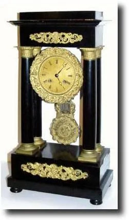 C.1875, French, 4-Column Empire mantel clock in good running order. The consignor just had the movement professionally cleaned and it has been running and striking here in the office. There are some chips in the veneer all around the case, but none really glaring (see top right edge of base in photo). The well made bell strike movement is numbered simply 194, and with a gridiron pendulum with cast rose in the center; original hands, and neat gilt dial with engine turned pattern. If you overlook the small cosmetic blemishes, this is a clock that can be enjoyed from the start. With key. Height 18" Reserve $600