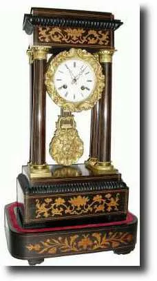C.1875, French, 4-Column Empire mantel clock complete with original dome and base. This clock is not quite the quality of the previous 3; the dial has some small hairlines, the case with a little twist in it due to the columns drying. The mahogany veneered base with matching inlay and with a little velour liner where the dome fits in the groove; one foot on the base is missing a piece (left). Height 22" $700-900