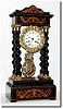 This clock came to us from storage and was quite dusty. There is an old repair to the porcelain dial by the "8" which could be improved. Retains original hands, pend, bell and case hardware. The case is ebonized mahogany with satinwood floral inlay; minor chips in veneer around the edges, and some loose glue joints. The 4 barley twist columns are sound and without cracks. Movement is sound; overall a decent clock that will restore fine; Height 19'