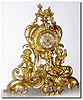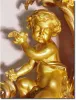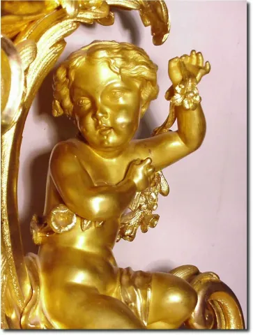 This is a very large (and heavy) clock, featuring two cherubs amongst scrolls and waves, boy holding a cockatiel, the girl with flowers. The gilding on this clock is still quite brilliant (with wear on some edges and corners), and it is very impressive. The ormolu dial has 12 individual porcelain signets, all in perfect shape. The pendulum is a well detailed ormolu shell at the end of a steel rod. Bell strike movement signed G. Philippe, Palais Royal; Height 24.5'