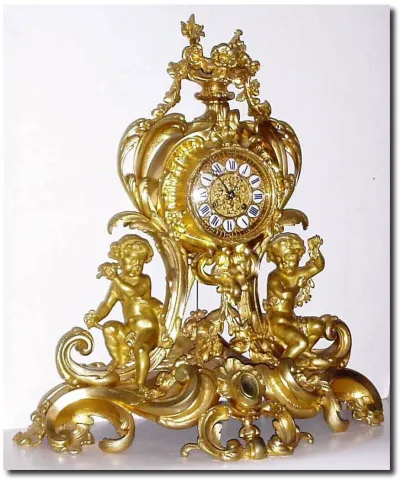C.1875, French, an Ormolu Fantasy in the style of Louis XVI. This is a very large (and heavy) clock, featuring two cherubs amongst scrolls and waves, boy holding a cockatiel, the girl with flowers. The gilding on this clock is still quite brilliant (with wear on some edges and corners), and it is very impressive. The ormolu dial has 12 individual porcelain signets, all in perfect shape. The pendulum is a well detailed ormolu shell at the end of a steel rod. Bell strike movement signed G. Philippe, Palais Royal; Height 24.5'