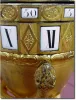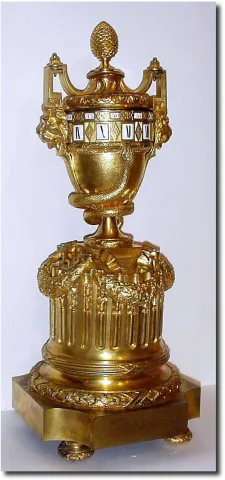 This is a PENDULUM clock, the large square movement in the base, driving the minute ring with a vertical shaft up through the urn; motion work behind the dials driving the hour ring. Note the dial rings are also of well chased ormolu and with applied porcelain cartouche numerals, an ormolu serpent pointing to the time. Although there is no damage to the dials, the case got tweaked at some time, and the urn has a slight list to the left. We tried loosening the case screws to adjust this, but it will require a shim to bring it in line. The bell strike movement is clean and running. Rare with a pendulum. Height 19.6'