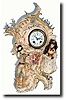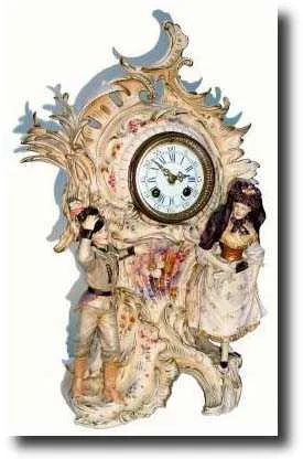 china clock of the finest quality, showing a young man in his uniform to the left and a lady in formal dress to the right, the case profusely decorate...