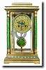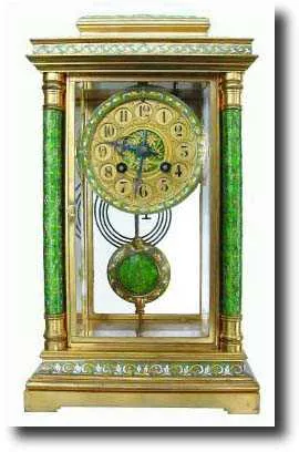 with green, white and yellow cloisonn? on the apex, top and bottom bands, bezel, pendulum and dial center; and with translucent green with tiny gold a...