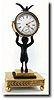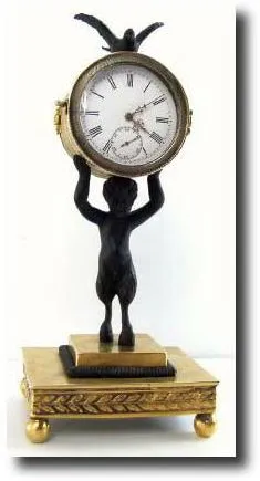 C.1875, Small Bronze Figure of Puck or 'Goat Boy , 'carrying a barrel overhead, on which is setting a dove. In the barrel is a Swiss finger bridge key wind watch movement, with fancy gilt hands. This is a cute miniature and the watch even runs. Height 7" Reserve: $350