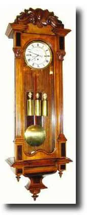 C.1880, Austrian, 3-Weight Grand Sonnerie wall regulator in generally good condition, with restorations. Note the movement fits the case fine, but there are extra holes in the case back indicating it is not original. The case has some minor nicks and scrapes that could be touched up. The porcelain dial is signed F. Prihoda, Wien and has no chips nor hairlines. Seems to be running OK. Although not for the purist, this is a good looking clock; Height 47" $900-1200