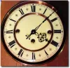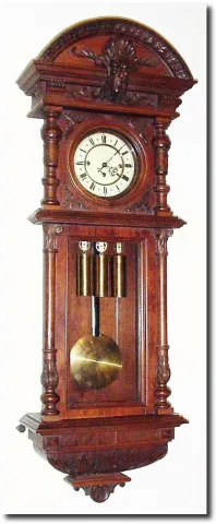 C.1880, Austrian, "Gebruder Resch-Remember' 3-weight, grand sonnerie wall regulator. The movement has a broken pivot on the quarter strike side that will need professional attention. However, this has a quality Viennese movement that is otherwise complete and intact with all levers, springs, hands, etc. (runs as timepiece if you shut the strike off). Serial no. 16475, matches on movement, pendulum and bracket . The walnut double door case is exceptional with a carved "Northwind' face at top, and leafy carved base. The porcelain dial is cream colored and with geometric symbols between each numeral. I would have a $500 higher estimate on this all original clock, if it were not for the pivot. Height 49'