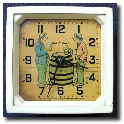 HAPPY DAYS, with two beer drinkers standing either side of a large beer barrel, labeled "3 point 2", the left drinker's arm is supposed to lift his mu...