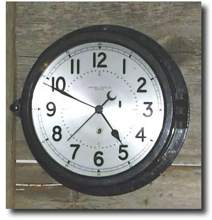 Case: Black phenolic with hinged bezel. 8" dial. Works: Chelsea 8 day time only movement with sweep second hand Condition: Case - excellent; Works: Ex...