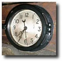 Silvered Dial World War ll Navy clock. Case: Molded Phenolic 6" diameter Works: Chelsea works with their standard gold plated brass gears. Reference: ...