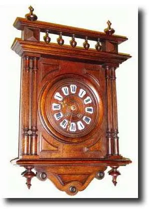 C.1880, French, a good Walnut Cartel clock with double reeded side columns and banister style top. This is roughly the same time period as lot 26 and 27. The movement is a robust unit with solid square plates and anchor escapement. The twelve porcelain numerals are attached to a round wooden dial, and the hands are pierced brass; some old wood worm damage in the lower part of the case; no evidence of activity at this point. Generally very good condition. Height 23" $300-500