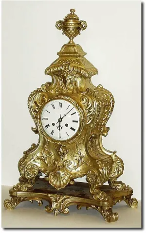 This case is profusely decorated with flowers, shells and scrolls, and with a bust of Diana above the dial. The case was neglected and then polished and all of the gilding is absent. The porcelain dial was chipped around the winding holes and poorly repaired. Movement runs Ok and strikes on a bell. If you are good at metal finishing, you could make improvements here; an imposing piece; replacement pendulum; height 23'