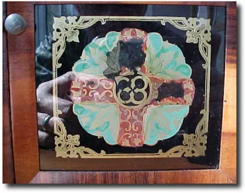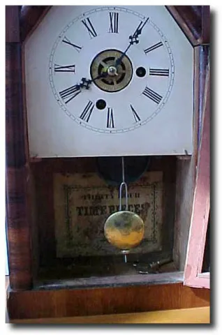 The movement is a 30 hour with alarm and strikes the hour on a bell. A very clean case with some flaking to the original dial and tablet. by E.N Welch...