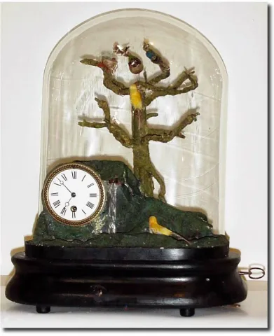 C.1880, French, Automaton and Clock, a Small Bird display under dome. The birds sort of twitter around, but do not "fly' as in larger models; wings do not move. The bellows are leaking and the volume is weak. The twisted glass "water fall' also turns when the automaton runs. 8-day time only movement. It is a colorful display that deserves restoration. With glass dome; width, 13', height 18'