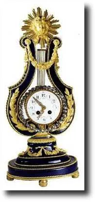 C.1880, French, Blue Cobalt porcelain lyre clock with ormolu mounts. This clock is on the small side, with 3" dial and 4" brilliant ring (ring swings from side to side when clock runs). The ormolu retains original frosty yellow gilding, and the detail on the mounts is very fine. The porcelain dial is excellent with polychrome floral decorations. Note the ring hangs a tiny bit lower that we are used to seeing, and it appears that a shorter suspension spring would correct this. See also hand chased "lyre" hands that retain their original gilding. A nice little clock; Height 17" $4000-5000