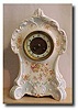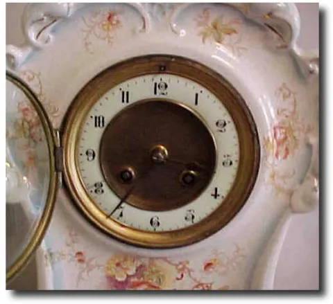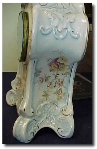 Japy Freres eight-day movement strikes the hour and 1/2 hour on a coiled gong. Pretty porcelain dial with a brass insert. 14 1/2"tall. Additional keyw...