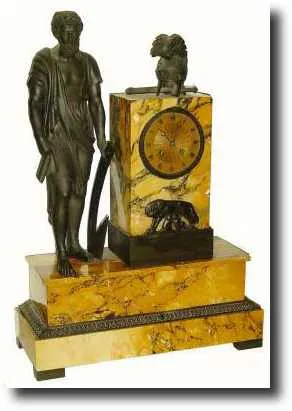 the dial signed E. CHARLES, a PARIS, the movement signed Pons and France. This clock is large and heavy, weighs 65 lb. After uncrating it, I had to take the photo on the floor, so be prepared for the task of getting it home. The weight is because the marble is NOT veneer, rather each of 3 solid blocks has been drilled to accommodate the movement and pendulum. Figure is a Roman soldier, home from battle, his helmet, sword and scabbard atop the clock, and in his hand a scroll (deed?), and in his left hand a plow; below the dial are two infants nursing from a wolf. High quality. Needs cleaning; Height 23" $2500-3000