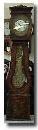 with original grain painted case. Beautiful stamped brass dial surround and large pendulum. Porcelain dial signed by maker Rouilier of Pontorson. The ...