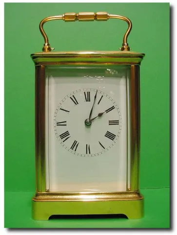 A polished brass corniche cased French striking carriage clock. The 8-day movement with original silvered English lever platform escapement chiming ho...