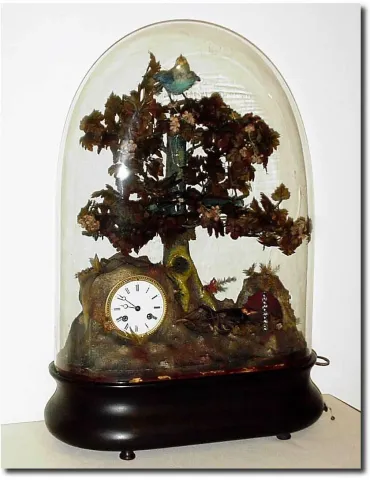 C.1880, French, Musical Bird Automaton and clock. This is a large unit, top bird at rest, and center humming bird that appears to "flit' from branch to branch, the bottom bird tipping as if to drink from the "fountain', a turning rod of glass (in little alcove on right). With a two tune, pull wind music box that may be activated either independently or in conjunction with the key wind tweeting bird mechanism. And with a perfect glass dome. Height 23.5'