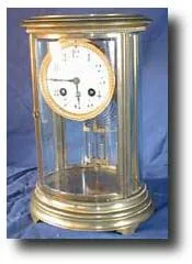 Case: Brass oval case with porcelain dial and beveled glass. Beading on top and bottom. Real mercury compensating pendulum. 10.5" tall. Works: Japy Fr...