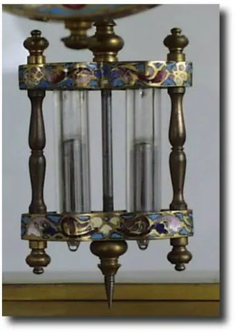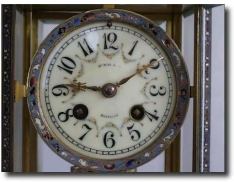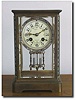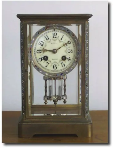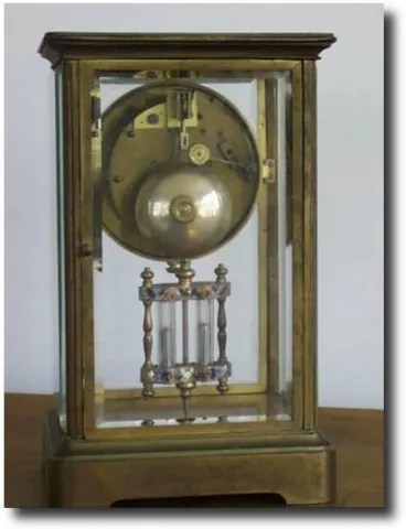 Case: Brass and beveled glass, floral decorated, with mercury pendulum. Light blue, medium blue and dark red. 9 7/8" tall x 6" wide x 5" deep. Works: ...