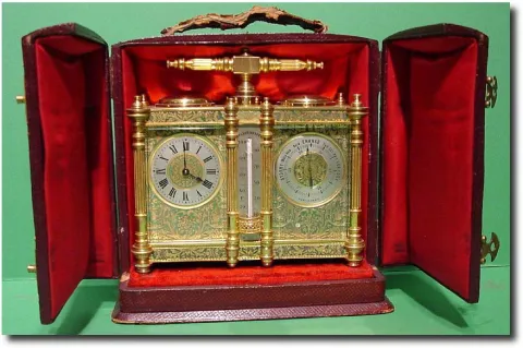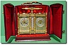 A gilt bronze and green enamel French Desk Compendium in an original leather travelling case. The 8-day French movement with original silvered English...