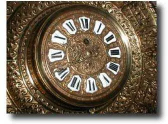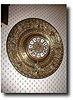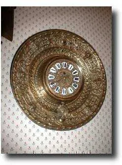 Initials and design logo on movement back plate - indecipherable. 16" diameter; eight day solid brass plated movement. Condition: MINT Additional Deal...