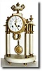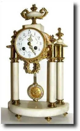 C.1880, French, Portico Mantel Clock, Marble and gilt bronze in the style of a century earlier, and in very good condition. The only small shortcoming which would bother a purist is the pendulum, which is a GREAT crystal regulator pendulum with a ring of brilliants and a cast button in the center, all with original frosty gilding. We would pay $100 for the pendulum alone if it were separate. (This clock would have had a sunburst pendulum) The rest of the clock is very clean, the bell strike movement running and with a perfect porcelain dial with floral polychrome center. All the marble is sound with no chips nor cracks and all the ormolu trim is intact. Overall excellent. Height 15" Reserve $500