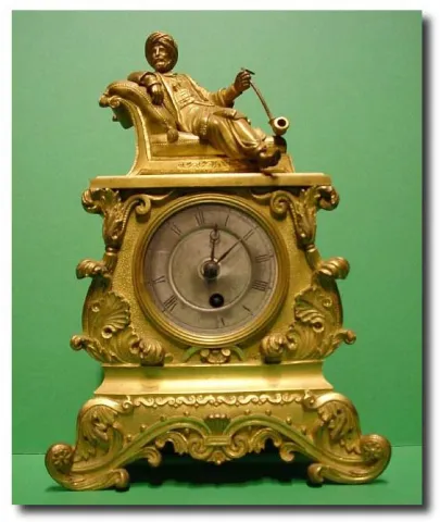 A gilt ormolu French first empire timepiece mantel clock with figure of a middle eastern man seated holding his pipe, silk suspension movement. Signed...