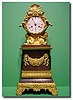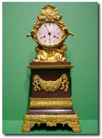 Gilt ormolu and bronze First Empire French mantel clock by "Douillon". The gilt ormolu and bronze case with two cherubs holding the face with gilt swa...