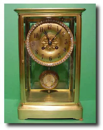 A Gilt brass French four glass clock with signed ivory miniature pendulum surrounded by diamante paste stones. The pendulum with a hand painted miniat...