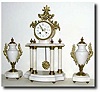 in the style of a century earlier, and in good condition. One of the column bases (bronze) has a fracture that is not too noticeable, and the top trim has been broken and repaired (decent rivet job). The white marble is nicely molded with a bow front base on both the clock and urns, and all bronze feet are intact. The well made French movement is signed "Paris Make, France", retains original pendulum and the bezel number matches the movement. Has a porcelain dial that is good except for a small chip by the F/S stud, and with colorful polychrome floral trim and original fancy hands. The side pieces are solid marble with ormolu trim; one 'wing' is loose. Height 16" Reserve $650