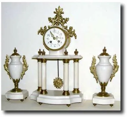C.1880, French, Portico Mantel Set, Marble and Bronze in the style of a century earlier, and in good condition. One of the column bases (bronze) has a fracture that is not too noticeable, and the top trim has been broken and repaired (decent rivet job). The white marble is nicely molded with a bow front base on both the clock and urns, and all bronze feet are intact. The well made French movement is signed "Paris Make, France", retains original pendulum and the bezel number matches the movement. Has a porcelain dial that is good except for a small chip by the F/S stud, and with colorful polychrome floral trim and original fancy hands. The side pieces are solid marble with ormolu trim; one 'wing' is loose. Height 16" Reserve $650