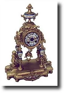 Gold finished case with seven Sevres porcelain vases, palques, etc. on sides. 8-day time and strike movement with free swinging pendulum. Dimensions: ...