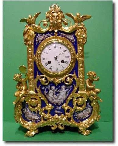 A good quality gilt bronze and blue porcelain paneled French mantel clock, the gilt bronze case with blue porcelain panels painted with cherubs playin...