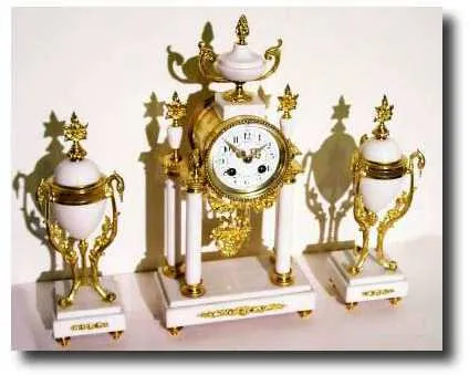 C.1880, French Portico Set, in the style of Louis XV white marble and ormolu, with restoration. The ormolu has been polished to brass and lacquered; actually looks quite flashy. The porcelain dial is excellent, with original polychrome floral wreath decorations. Good round movement strikes the hours and halves on a bell. Note pendulum which is a floral basket. Height 16" $500-750