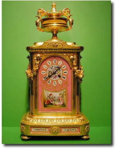 A French gilt metal and porcelain late 19th century mantel clock, the gilt ormolu case with swags to the sides, acanthus cast gallery to the base rais...