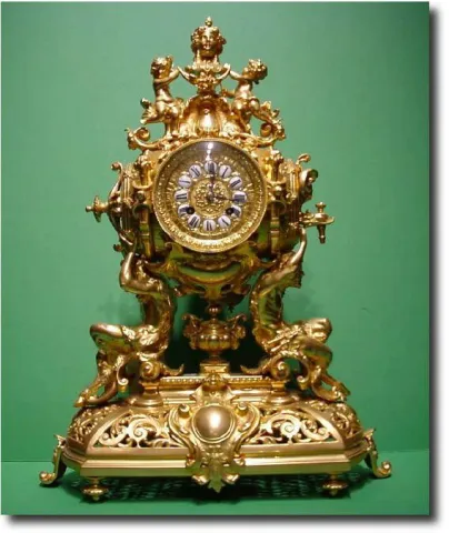 Gilt ormolu French mantel clock with 8-day movement chiming hours and half hours on a bell. The case in the form of a wine barrel with cherubs sitting...