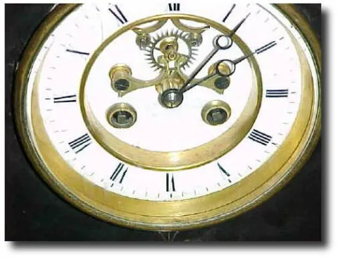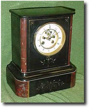With Brocot pin-pallet visible escapement. Quality movement striking on a bell. Height 11 inches circa 1870. Additional keywords: black mantel, mantle...