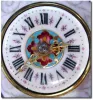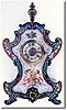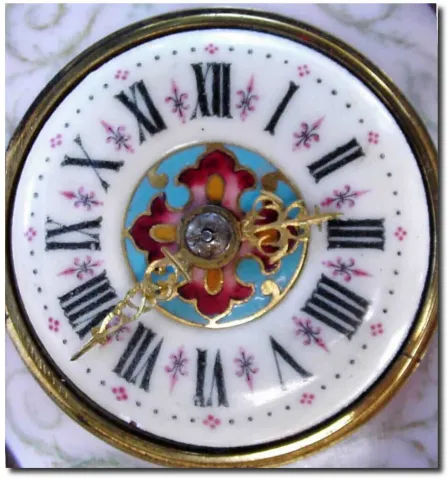 The porcelain dial is only 1', nicely decorated as well, and with gilt and chased hands. The tiny platform time only movement is wound from the rear. The photo is deceiving, as the entire clock, tip to tip is only 10 inches.